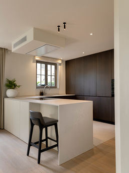 De lage kastenwand werd uitgevoerd in lakwerk, volledig afgestemd op dezelfde RAL-kleur als de muren, voor een harmonieus en ingetogen geheel. Zo ontstaat een keuken die zowel elegant als functioneel is, waarin natuurlijke materialen en verfijnde details perfect samenkomen.
