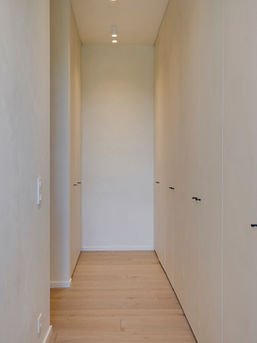 Zachte rondingen sturen de circulatie, terwijl de hoge kastenwand discreet opgaat in de ruimte. De ingewerkte deuren lopen in één lijn door, waardoor het materiaal en de architectuur alle aandacht krijgen.